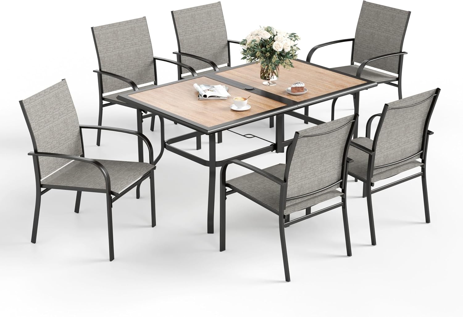 • PATIO DINING SET FOR 6: This Outdoor dining set includes 6 chairs and 1 rectangular dining table with adjustable umbrella hole. Ideal for your backyard, garden, yard, lawn and deck, providing a relaxing outdoor dining or gathering place for family and friends