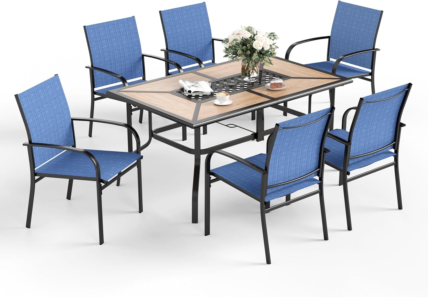 7 Piece Patio Dining Set for 6, Rectangular Metal Dining Table with Umbrella Hole and 6 Textilene Chairs, Outdoor Table and Chairs Set for Lawn Backyard and Deck, Blue